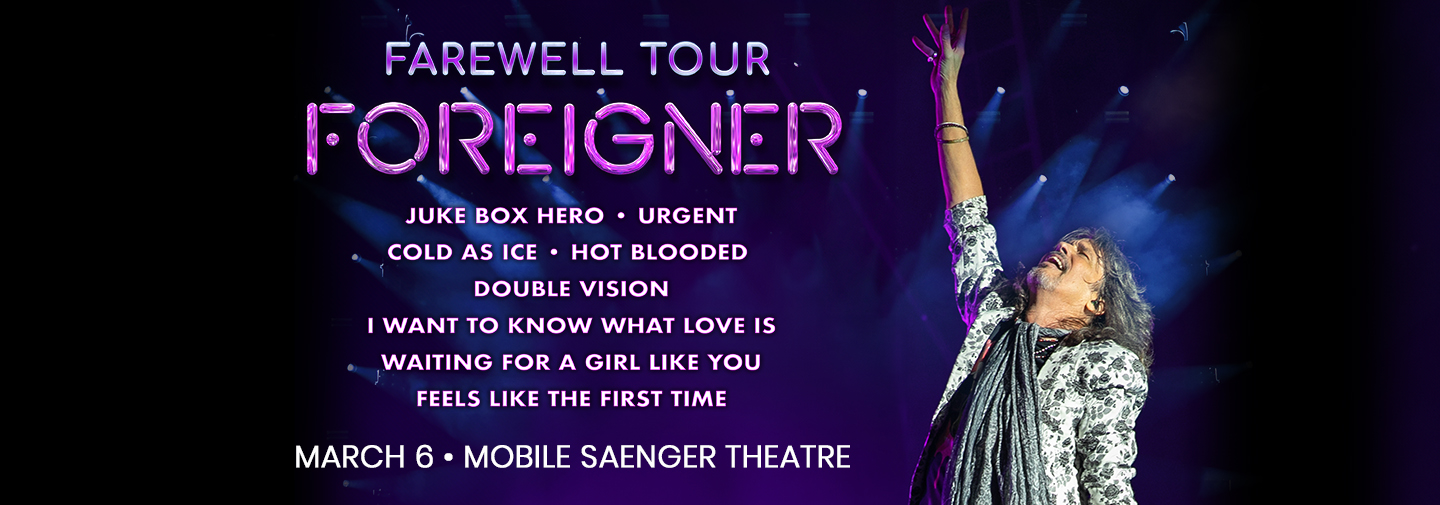 Tickets can be purchased online at https://bit.ly/foreigner24. Purchase in person at the Saenger Theatre Box Office (6 South Joachim Street; open Monday – Friday, 10 a.m. to 2 p.m.; 251-208-5600) or the Mobile Civic Center Box Office (401 Civic Center Drive; open Monday – Friday, 9 a.m. to 5 p.m.; 251-208-7906). For information regarding accessible seating tickets, call 251-208-7381. The historic Saenger Theatre building is not elevator equipped. (Additional fees, service charges and/or taxes may be added to ticket prices. All dates, acts and ticket prices subject to change without notice.)