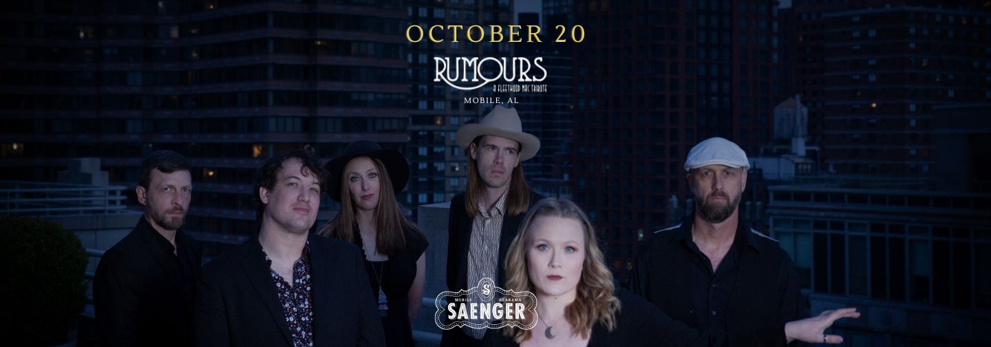 Tickets can be purchased online at https://bit.ly/rumours23. Purchase in person at the Saenger Theatre Box Office (6 South Joachim Street; open Monday – Friday, 10 a.m. to 2 p.m.; 251-208-5600) or the Mobile Civic Center Box Office (401 Civic Center Drive; open Monday – Friday, 9 a.m. to 5 p.m.; 251-208-7906). For information regarding accessible seating tickets, call 251-208-7381. The historic Saenger Theatre building is not elevator equipped. (Additional fees, service charges and/or taxes may be added to ticket prices. All dates, acts and ticket prices subject to change without notice.)